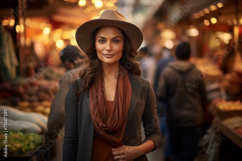 Portrait of a content indian woman in her 40s donning a classic fedora against a bustling urban market. AI Generation