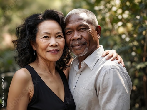 Portrait of a couple of black man from Africa and white woman from Asia, individuals of different races