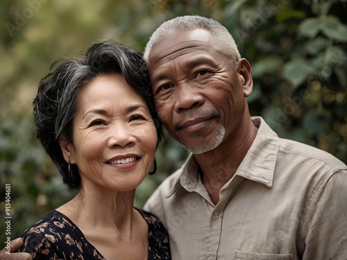 Portrait of a couple of black man from Africa and white woman from Asia, individuals of different races