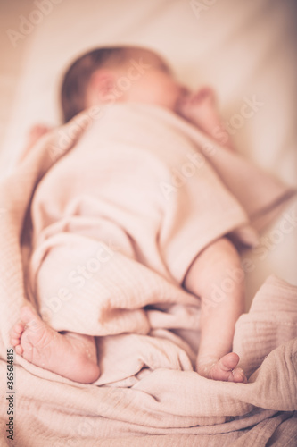 Portrait of a cute adorable white Caucasian baby newborn in diaper, sleeping dreaming, lying on bed, covered with blanket, view from top above. Cute little baby sleeping on bed at home.