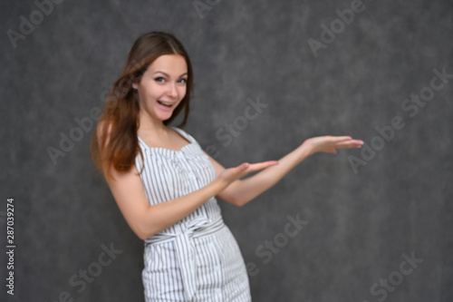 Portrait of a cute brunette girl, a young woman with beautiful curly hair in a gray dress on a gray background. Smiling, talking with emotions, showing hands to the sides.