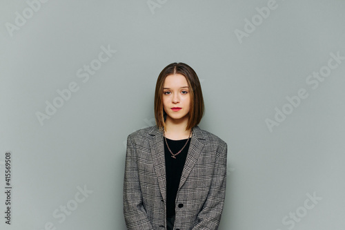 Portrait of a cute business lady in a jacket on a gray background, looking at the camera with a serious face. Isolated.