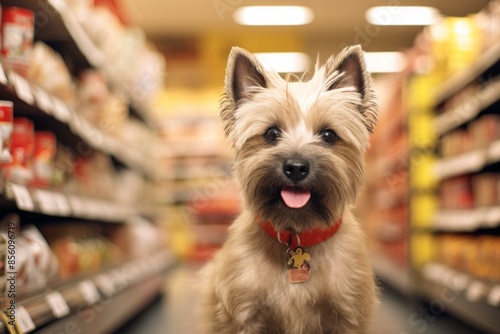 Portrait of a cute cairn terrier isolated in busy supermarket aisle background