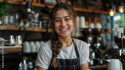 Portrait of a cute, smiling barista in a coffee shop. White t-shirt and black apron. Long brown hair in a braid.