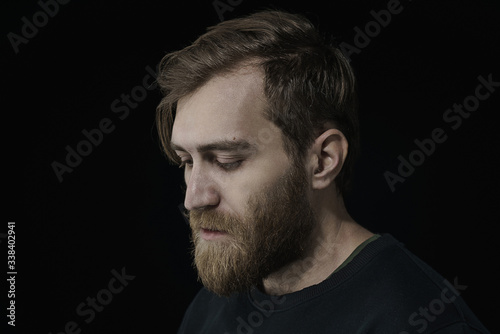 Portrait of a depressed middle aged man in a dark sweater on a dark background.