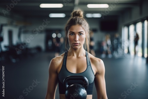Portrait of a determined girl in her 20s doing kettlebell exercises in a gym. With generative AI technology