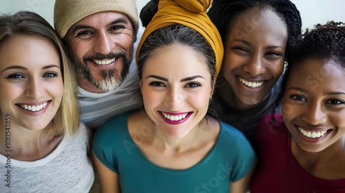 Portrait of a diverse group of young adults,men and women of different races and ethnicities,smiling happily and interacting together in a casual studio setting,representing concepts of teamwork.