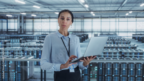 Portrait of a Female Data Center Engineer Using Laptop Computer. Server Room Specialist Facility with Multiethnic System Administrator Working with Data Protection Network for Cyber Security.