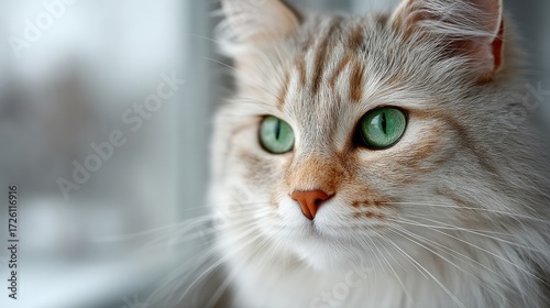 Portrait of a Fluffy Silver Cat with Green Eyes Soft Lighting and White Background