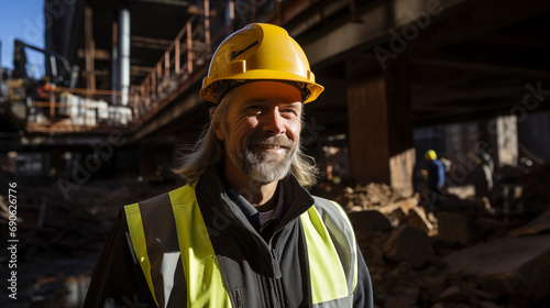 Portrait of a foreman or worker against the backdrop of a construction site. Construction site manager wearing a hard hat and safety vest. A satisfied manager looks at the camera. AI generative