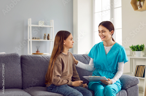 Portrait of a friendly smiling female nurse or doctor woman pediatrician supporting a sick child teenage girl patient sitting on sofa at home after medical examination. Health care concept.