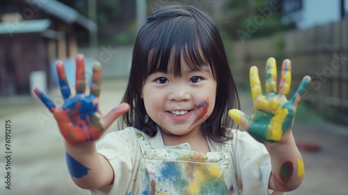 Portrait of a funny Asian girl shows hands dirty with paint.