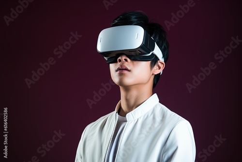 Portrait of a futuristic young man wearing virtual reality glasses.Generative Ai