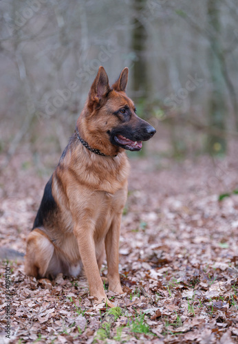 Portrait of a German Shepherd, 3 years old, sitting in full body, in the forrest, autumn leafs on the ground