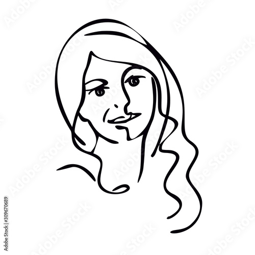 Portrait of a girl. Black line drawing. Laconic stylized image. Beautiful girl, woman.