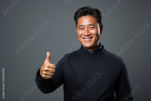 Portrait of a glad asian man in his 40s showing a thumb up while standing against minimalist or empty room background