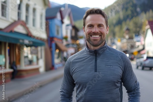 Portrait of a grinning man in his 30s showing off a lightweight base layer over charming small town main street