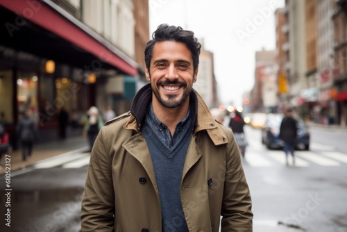 Portrait of a grinning man in his 30s wearing a chic cardigan against a busy urban street. AI Generation