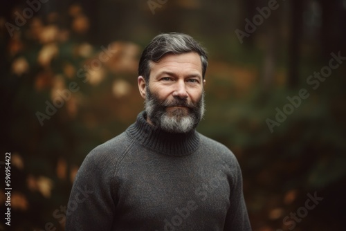Portrait of a handsome middle-aged man with a beard in the autumn forest