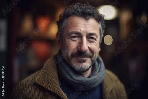Portrait of a handsome middle-aged man with grey hair and beard wearing a warm woolen sweater and scarf