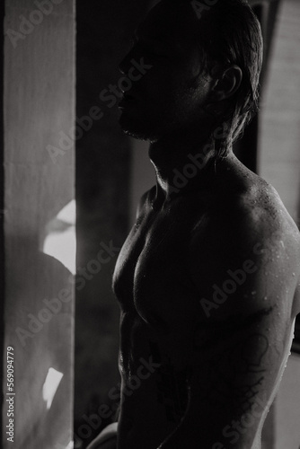 Portrait of a handsome muscular man in tattoos taking a shower.