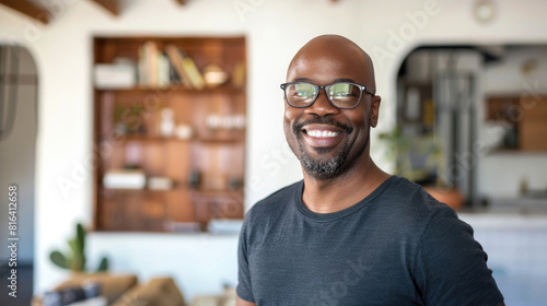 Portrait of a handsome smiling black man wearing a casual t-shirt and glasses at his home, white walls and wooden furniture in the background