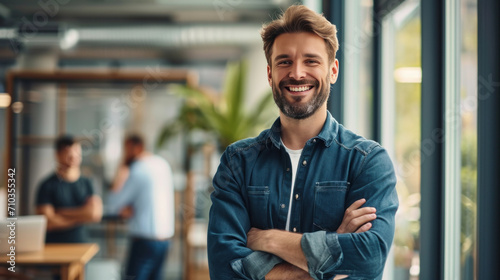 Portrait of a handsome smiling businessman boss standing in his modern business company office.