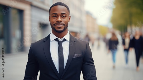 portrait of a handsome smiling white young black businessman boss in a black suit walking on a city street to his company office. blurry crowdy street background --ar 16:9