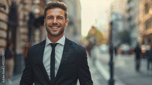portrait of a handsome smiling white young businessman boss in a black suit walking on a city street to his company office. blurry street background, confident
