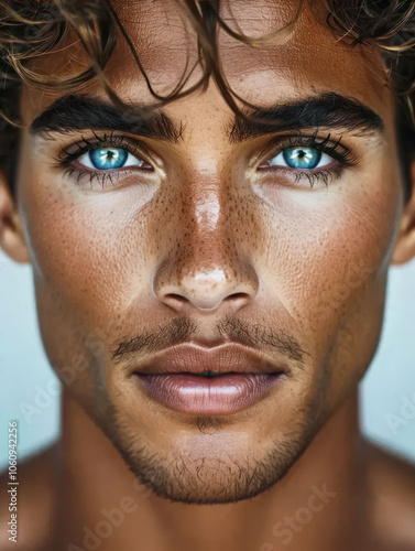 Portrait of a handsome young brunette man with blue eyes, close-up