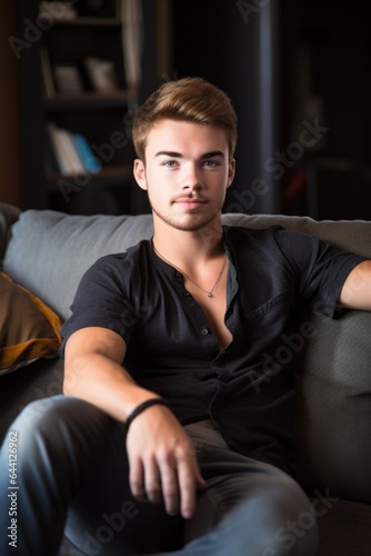portrait of a handsome young man sitting on his couch at home