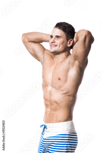 Portrait of a handsome young muscular man in swimwear with hands folded over his head isolated looking up on white background