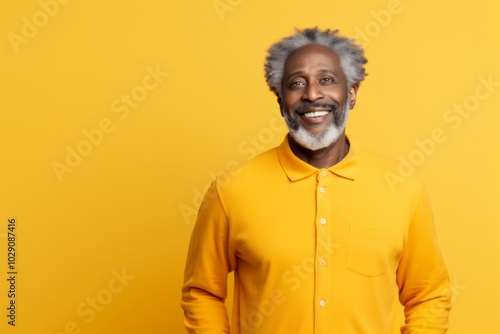 Portrait of a happy afro-american man in his 50s sporting a long-sleeved thermal undershirt in front of pastel yellow background