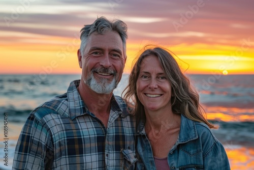 Portrait of a happy couple in their 40s dressed in a relaxed flannel shirt in front of vibrant beach sunset background