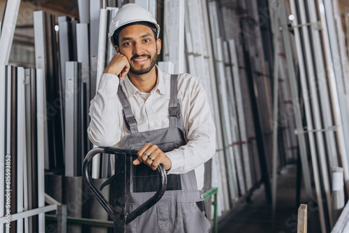 Portrait of a happy Hindu worker in a white hard hat and overalls holding a hydraulic truck against a background of a factory and aluminum frames.