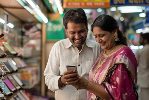 Portrait of a happy indian couple in their 30s buying a smartphone in store