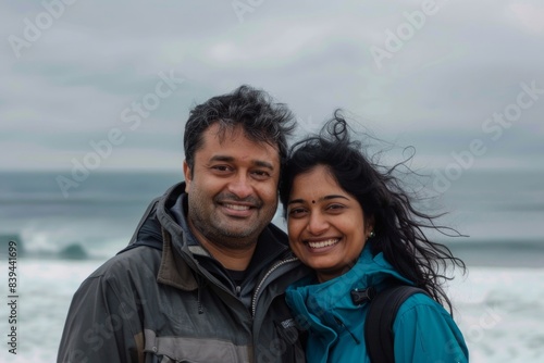 Portrait of a happy indian couple in their 30s wearing a windproof softshell isolated in tranquil ocean backdrop