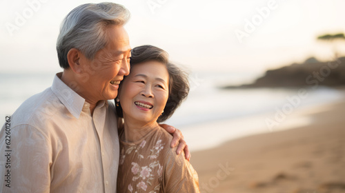 Portrait of a happy romantic Asian couple outdoors. Generative AI.