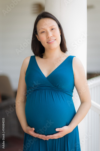 Portrait of a Happy Young Pregnant Chinese Woman on the Front Porch