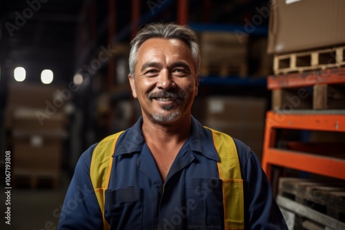 Portrait of a Hispanic middle aged worker leaning on pallet in warehouse