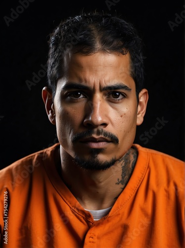 Portrait of a hispanic prisoner on orange jail uniform on plain black background looking at the camera from Generative AI
