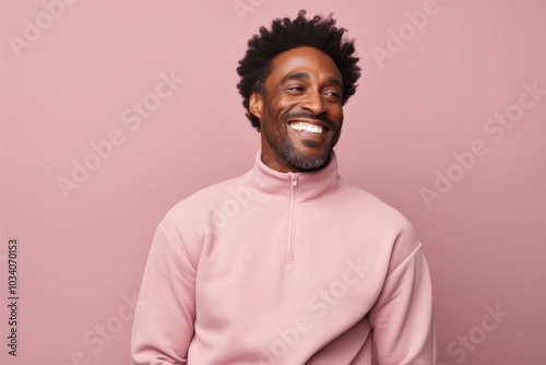 Portrait of a joyful afro-american man in his 40s wearing a thermal fleece pullover isolated on pastel or soft colors background