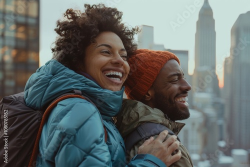 Portrait of a joyful mixed race couple in their 30s wearing a windproof softshell over stunning skyscraper skyline