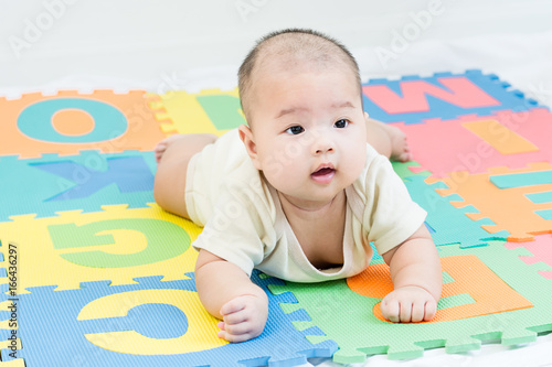 Portrait of a little adorable infant baby girl lying on the tummy on colorful eva foam indoors