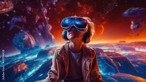 Portrait of a Little boy wearing virtual reality goggles.Generative Ai