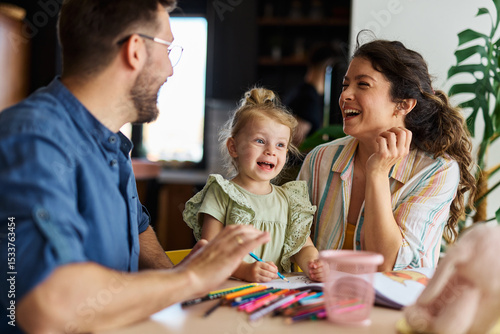 Portrait of a little girl and mother and father or teacher coloring a book in classroom or at home. Education and development concepts