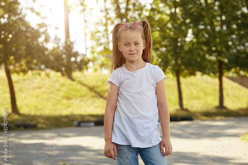 Portrait of a little girl in a white t-shirt with a pigtail on a Sunny day at sunset