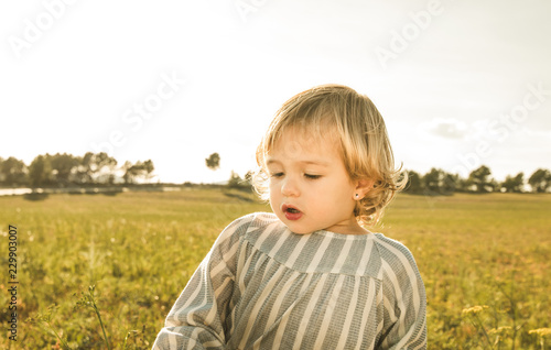 Portrait of a lovely little girl in the blonde field looking at the camera