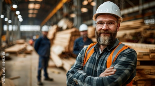 Portrait of a male carpenter at a construction site leading a team of carpenters