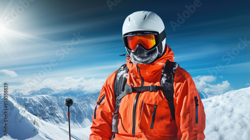 Portrait of a male skier in helmet and winter clothes on the background of snow-covered mountain slope
